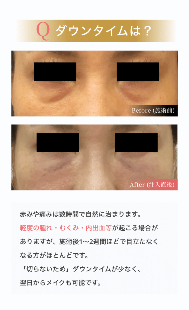 インターネットなどで「切らないクマ取り療法は膨らみすぎる」などの事例が記載されていますが、適切な施術を行っている場合は膨らみすぎることはありません。当院はこの施術に関する研究会のもとプロトコルを確立し、その手順に沿って適切に注入を行っているため膨らみすぎることはありません。